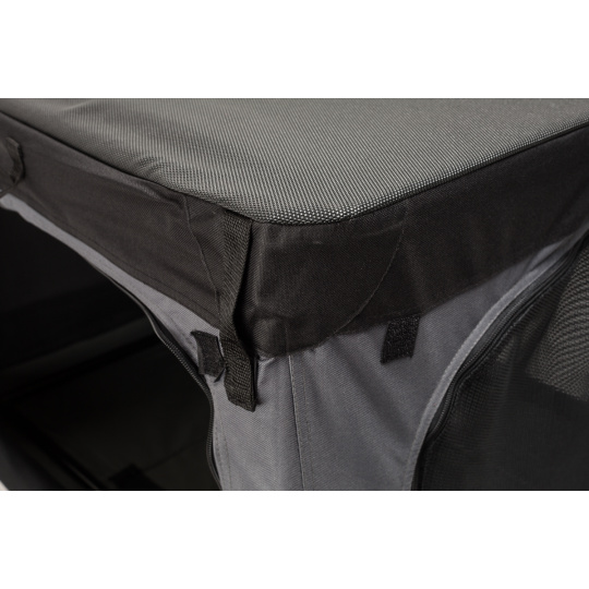 The foldable textile house COOL PET PLUS is a high-quality Czech product with a sturdy internal steel structure, very lightweight for carrying, and easy to assemble/disassemble. The internal steel frame ensures long-lasting durability and protection for your dog. Handles designed for threading through seat belts enhance your dog's safety. The little house can also be placed on the back seats. Special durable fabric, resistant mesh is used in all windows and entrances - one at the front, the other on the side. The entrances and windows can be darkened with a blind made of the same material as the entire box. Heavy-duty zippers ensure easy handling and long-lasting durability. Water-resistant foundation protects against moisture, for example. it won't seep inside from the wet grass. Ideal for transporting dogs and cats in the car, for trips, shows, vacations, and home use. The folded box is placed in the carrying bag. We recommend purchasing an additional mattress or pad in the dog mattress section, which is soft, comfortable, 3 cm or 5 cm thick, removable and washable, with a water-resistant surface, available in various colors and materials - eco leather, Oxford material, and more, a quality product by COOL PET.